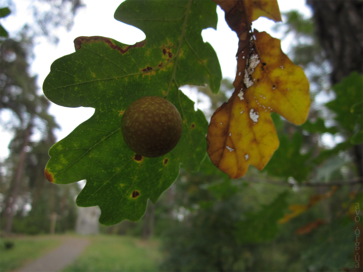 Ну теперь более умиротворенно. Вот, интересные «яблочки» растут у дубов непосредственно под листьями. Это не желуди, это кое-что иное. Насколько могу судить, это паразитическое образование, в котором виновато насекомое — галлица. Она прокалывает лист и откладывает туда яйца, а ткани листа под этим воздействием болезненно разрастаются вот в такие шарики.